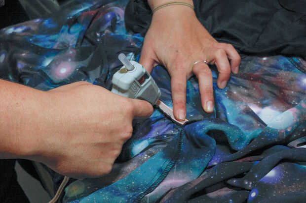 Empecé con la cinta EL y pegado el lado no-luminiscente de la cinta a la costura de la cintura, para que el lado brillante se muestra a través del frente del equipo. El rayón del vestido era muy indulgente con la pistola encoladora, funcionó muy bien.