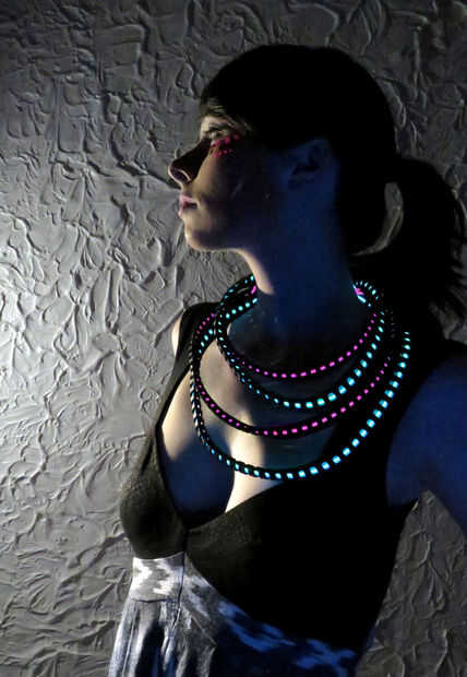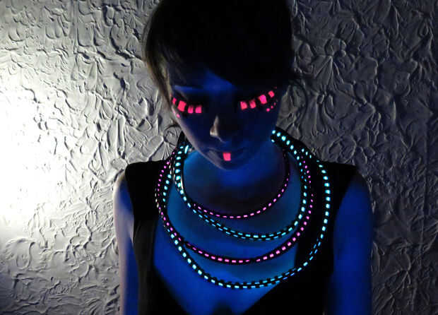 Me encanta alambre electroluminiscente (el wire), y creo que es un material muy incomprendido. A menudo obtiene una mala reputación en el mundo de la tecnología usable porque puede ser molesto trabajar con y puede parecer desordenado si no precisamente. Pero cuando se utiliza de la manera correcta, genera un efecto elegante y fascinante. Mucho de mi trabajo de traje participa tratando de encontrar nuevas e interesantes formas de usar el alambre. Para crear este diseño de collar que brilla intensamente, yo simplemente tejió dos colores de hilo a través de láser corte ranuras en una tira de cuero grueso y había conectado a una batería en la parte posterior del cuello.