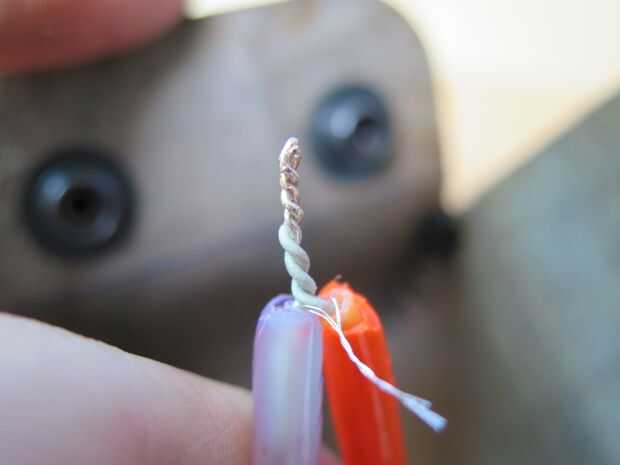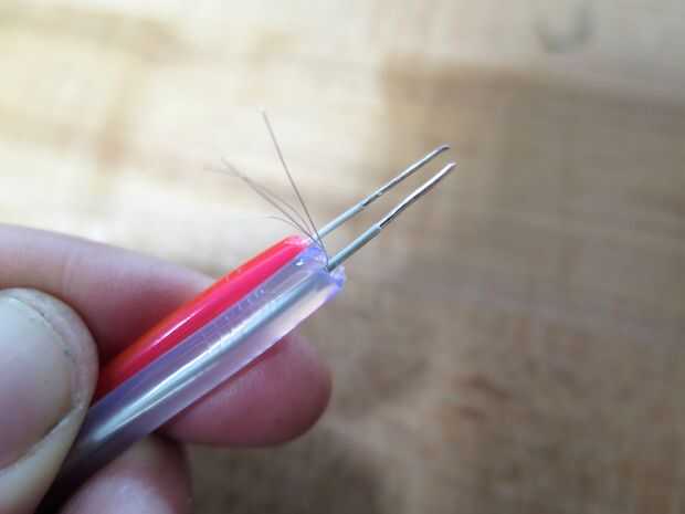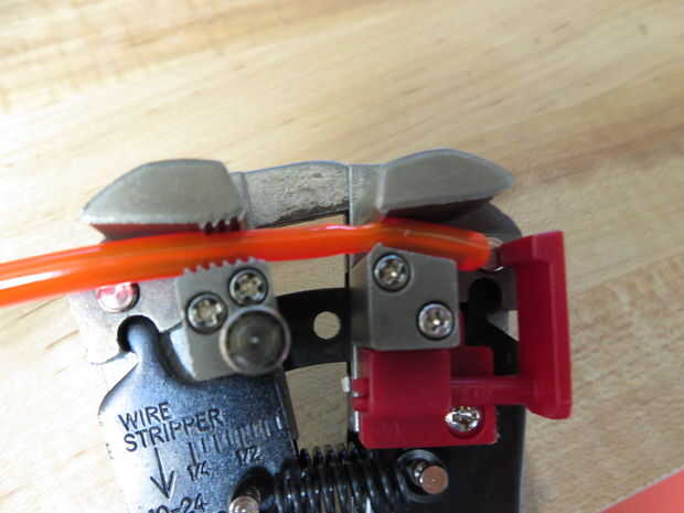 Tomar sus dos hebras de alambre y tira de aproximadamente 1" de un extremo de cada hilo con su pelacables automático. Puede ajustar cómo profundamente el stripper corta girando la rueda pequeña en la parte delantera. He encontrado que generalmente debían utilizar el stripper varias veces en el cable de 5mm para conseguir que la tira a través de todo el camino. Su objetivo es exponer el fósforo cubierto alambre de la base, sin romper los dos cables de pelo diminuto a su lado. Podría tomar varios intentos para llegar a esta derecha.