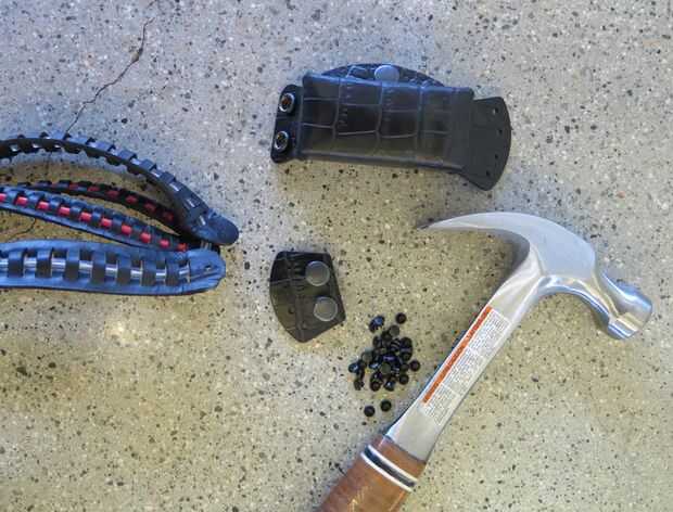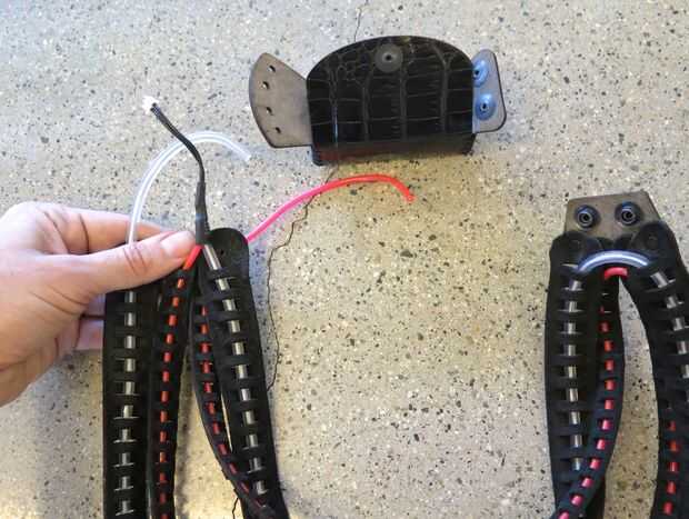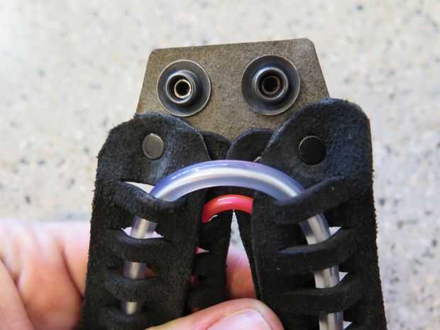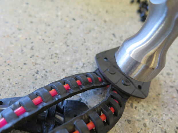 Alinee los orificios en los extremos del lazo de los filamentos con los agujeros en la ficha independiente del lazo los dos filamentos aqua en color de rosa unos. Remache los junto con los remaches negro pequeño y un martillo. Luego hacer lo mismo para conectar el otro extremo de los filamentos de la lengüeta de la caja. Si los extremos de los filamentos sobresalen un poco por debajo de las pestañas, recorte les con tijeras así lucen aseadas.