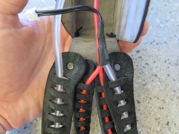 Coloque la batería espalda y filamentos para que pueda obtener el derecho de orientación. Desea que los extremos del lazo de los filamentos para adjuntar a la ficha independiente pequeño y los extremos soldados de los cordones para sujetar a la caja. También, asegúrese de que el cuadro está orientado para que el cierre de la ficha de complemento se hacia abajo de su cabeza cuando el collar alrededor de su cuello.