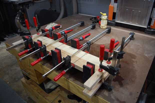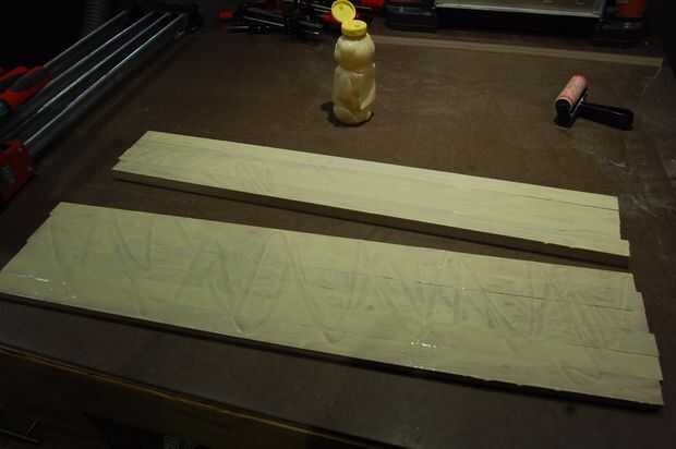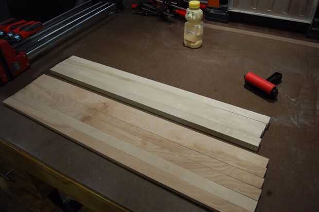 Puse todas las tiras planas, unte pegamento, alineación como pares y sujetan todo a la vez. Sólo prestar atención a su dirección de pegamento, o acabarás haciendo una tabla de cortar. Limpió cualquier apretón hacia fuera podría llegar a y que estas se siente durante la noche. Terminé con 2 espacios en blanco de álamo y chapas de madera contrachapada 3.
