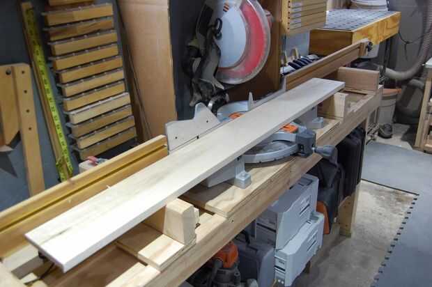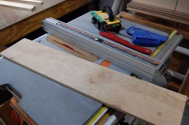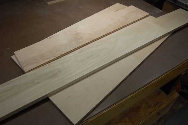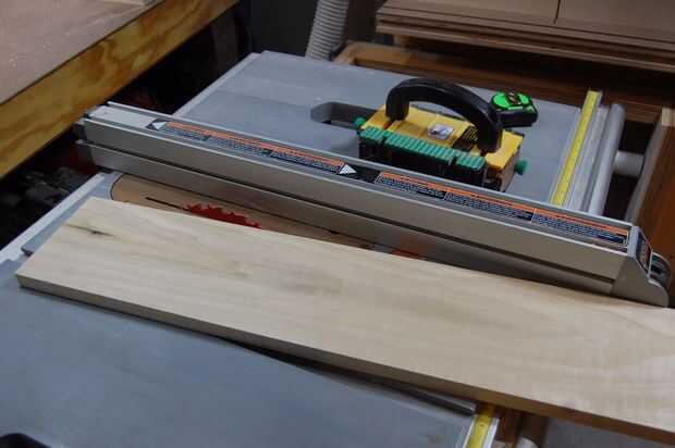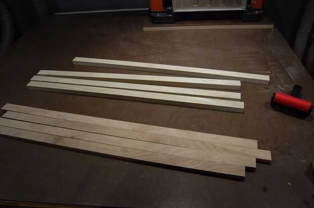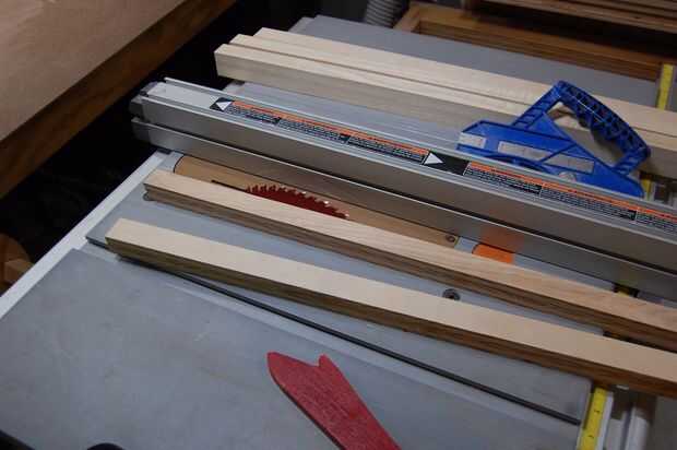 Para el álamo, empecé por una tabla para cortar a una longitud de 30". De esta forma, arrancó cuatro tiras de 1 1/4"... gran tamaño por lo que pueden recortarse post pegamento hacia arriba.