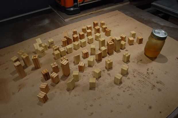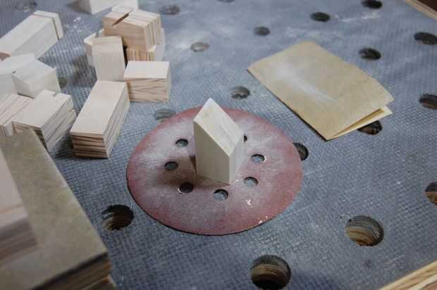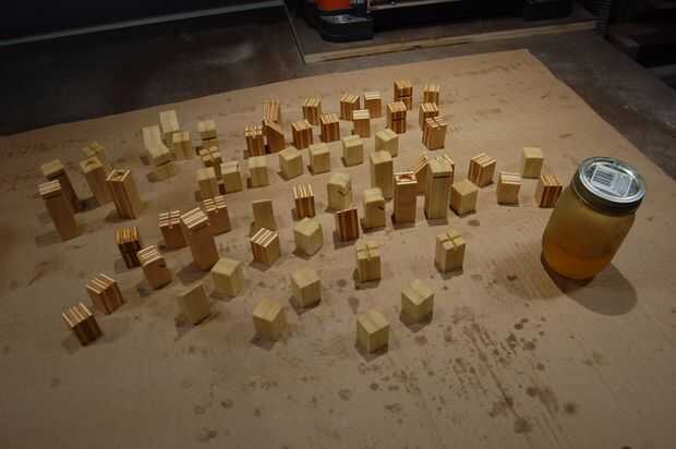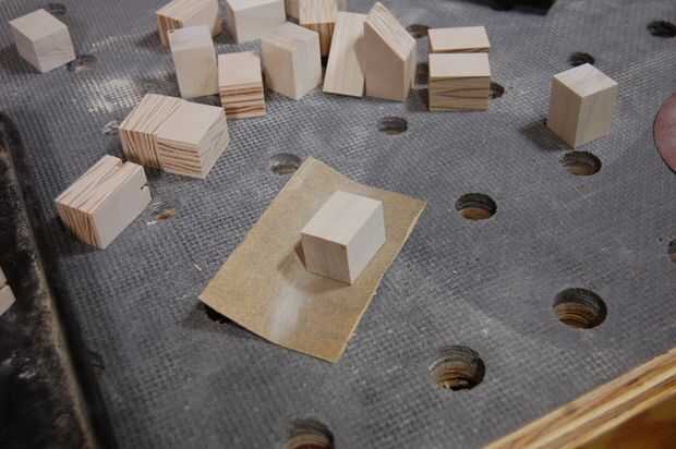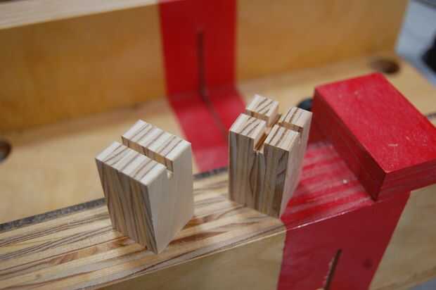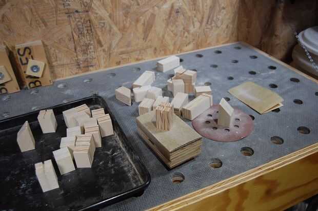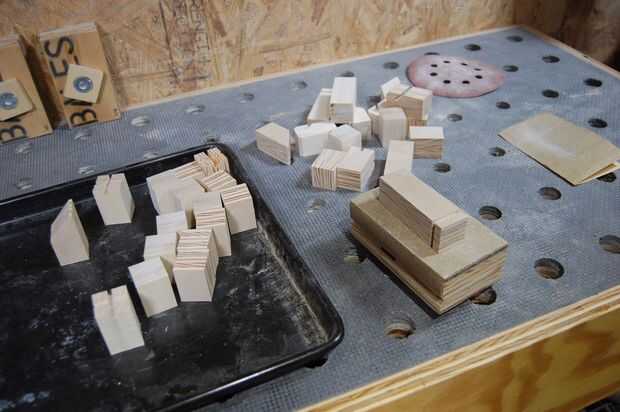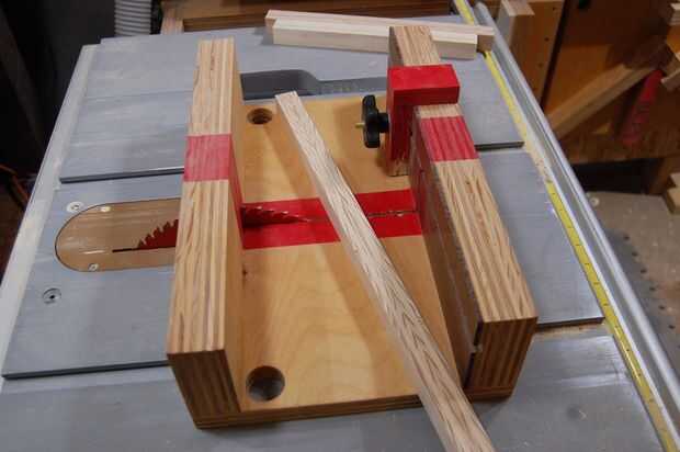 Usé mi trineo del crosscut de piezas pequeñas para cortar todas las piezas individuales. Recortado uno de los extremos al ras y luego se usa el bloque de tope para obtener cortes repetidos.