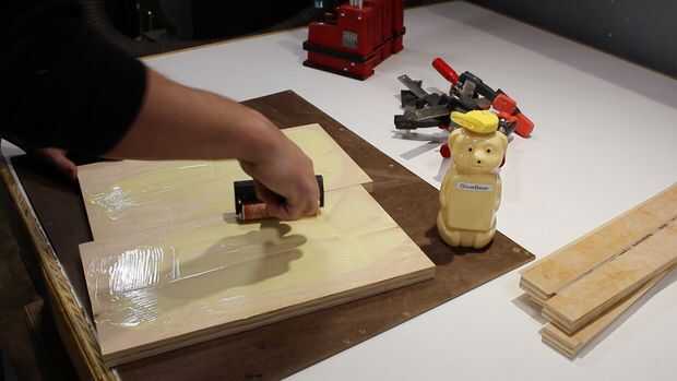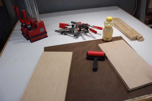 Lo primero es lo primero... Necesitaba laminar las planchas de madera para que voy a ser capaz de cortar tiras de 1 1/2". Es bastante sencillo... tableros contrachapados dos, pegamento y un rodillo de tinta de la tienda de artesanía... Añadir abrazaderas.