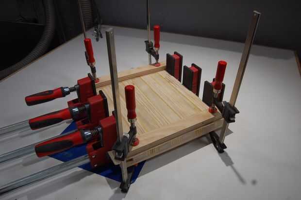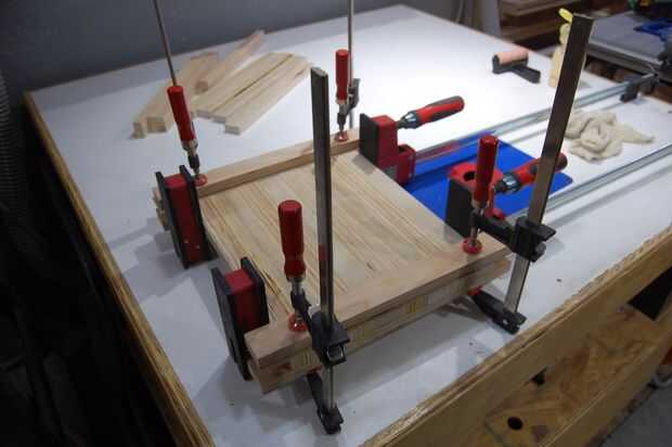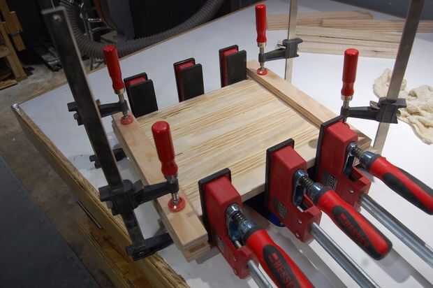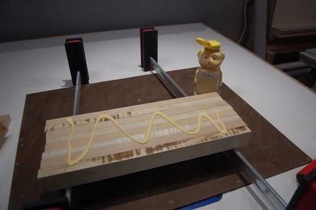 El primer pegamento para arriba es fácil. Alternar las tiras de madera contrachapada y álamo, parado en el borde, unte el pegamento, girarlas 90 grados para que sean en la cara y sujetarlos todo.