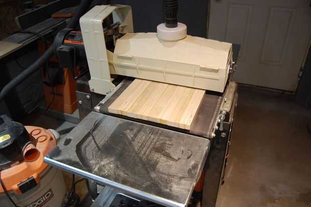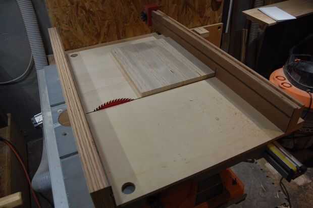 Para obtener un borde recto de un lado del panel, usé un gran trineo corte transversal en la Sierra de mesa.