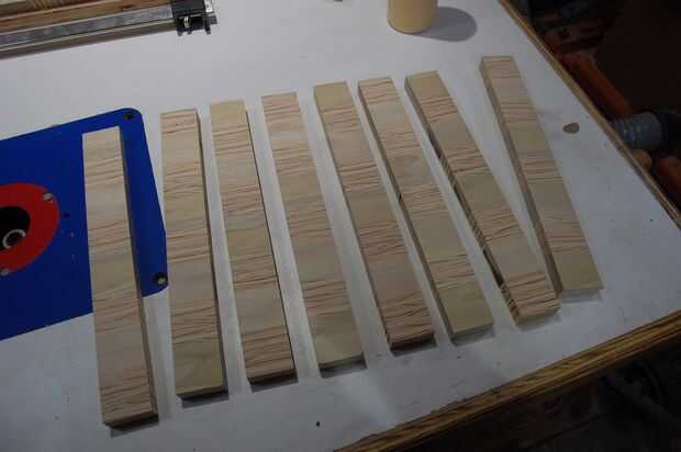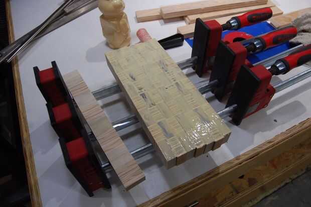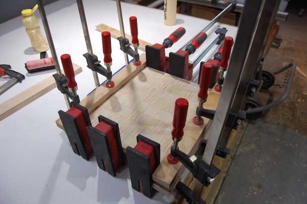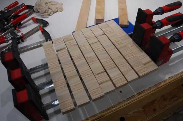 Soporte en borde, unte el pegamento, girarlas 90 grados por lo que son en la cara y sujetarlos todo. Otra vez usé cauls en los extremos para mantener el panel plano.