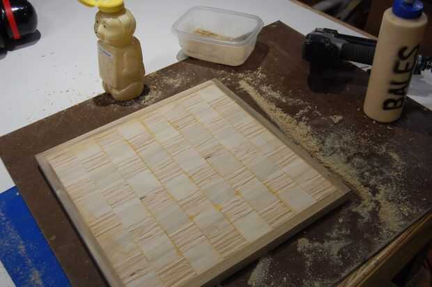 Una vez seco el pegamento, cualquier exceso de bandas fue quitada usando la Sierra de cinta y color arena con la lijadora de banda oscilante.
