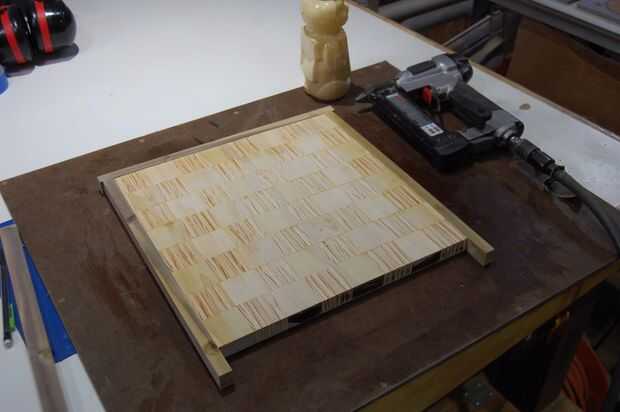 Usted podría ir a inglete aristas, pero me decidí en uniones a tope simple. Empecé con un borde... dejando el largo stock en cada lado. Las siguientes dos piezas alineen al ras con estos encima se cuelga. Después el pegamento curado un poco, corté estos dos bordes al ras con el panel utilizando la tabla VI y luego une la última sección de las bandas. Tenía unos huecos aquí y allá, así que los rellena con pegamento y aserrín.