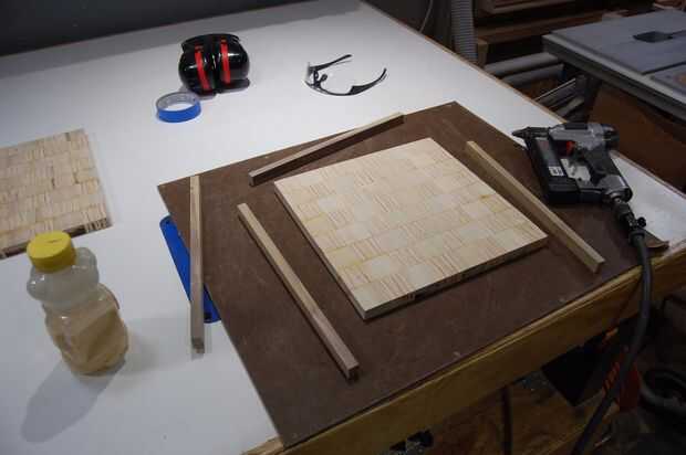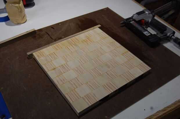 Decidí agregar las bandas de borde, por lo que mientras que el panel de secado, arrancó otra sección del álamo en anchos de 1/4". Fue unido con pegamento y unos cuantos pin clavos para sujetarlo mientras el pegamento seca.