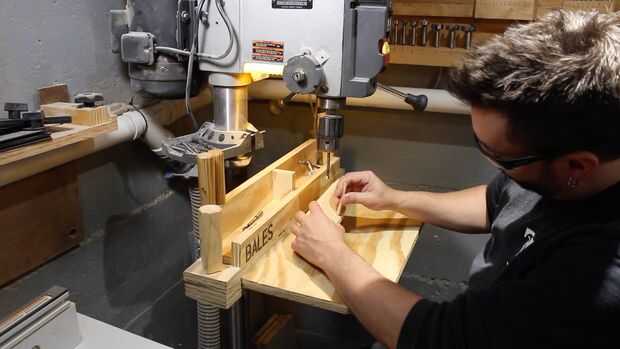 Empecé haciendo otra serie de agujeros de 45 grados en el cuerpo plano (uno a cada lado). Yo comentar la situación, que terminó siendo un poco delante del soporte del flotador trasero. En mi cabeza habría una puerta en el avión... así que no podía ir el apoyo justo en el medio. 1/4" agujeros fueron perforados utilizando la guía de taladro y la configuración del bloque V.