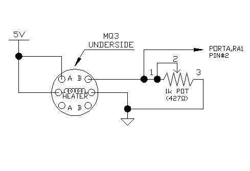 La idea básica es esta: cuando se sopla sobre la bobina del calentador a través del cabezal del sensor, el voltaje en los cambios de salida (en este caso pin B). Algunas personas dicen usar una k 100 trim-pot entre la salida y la tierra, pero nunca he tenido un buen resultado con una alta resistencia. Observe que el tirón de bote de viaje es 1 k ohmios. Calibrado a unos 427-428 Ohms, así que si querías salir una gama buena tensión en la salida, le sugiere usando una resistencia de 420 ohms entre la salida y tierra o el viaje-pot.
