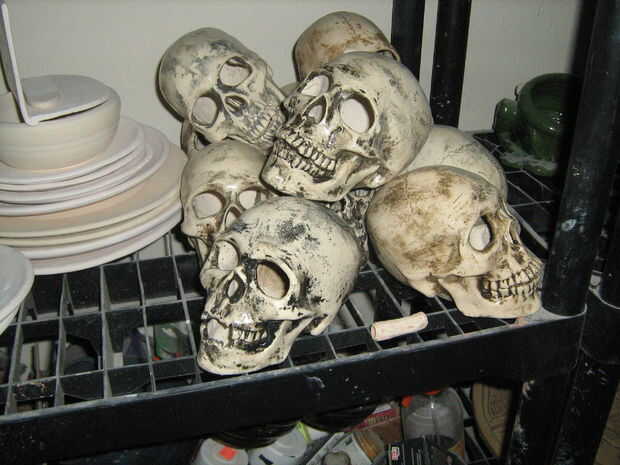 estos cráneos donde forman un molde comercial usando arcilla de Navajo blanco recuperado. lavar con bajo vidriado negro y marrón, limpiar la parte posterior y luego dispararon a cono 5