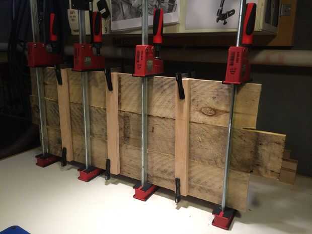 He limpiado los bordes en las tres tablas y había pegado como un panel, que servirá como la parte posterior y superior. Cuatro pinzas para los paneles y 6 abrazaderas más pequeño para los cauls mantener todo alinean tanto como sea posible.