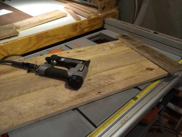 Para obtener un borde recto en un extremo de la espalda, viró en una guía con una clavadora. Corte largo, retirar a la guía, voltea el panel y corte a la longitud. Luego arrancó una pulgada de cada lado para lo top radiales en ambos lados igualmente.