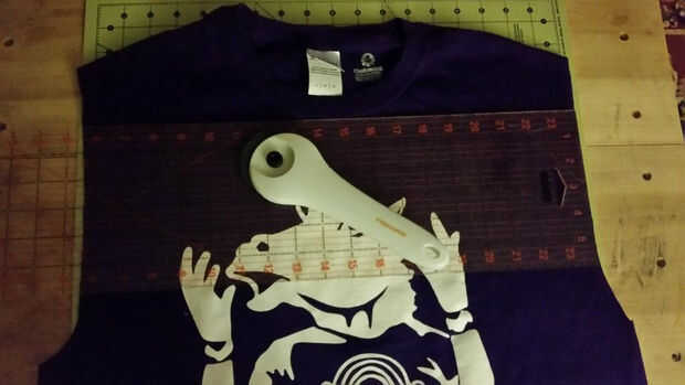 2. Tomar el cortador rotatorio y cortar justo en el interior de las costuras del brazo. Desde la axila hasta la parte superior. Quitar completamente ambas mangas. Guardar para futuros proyectos.