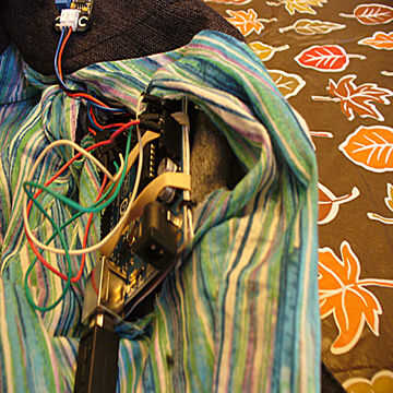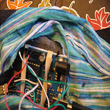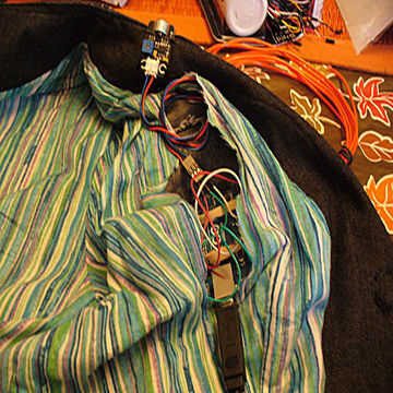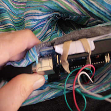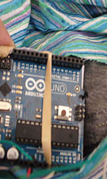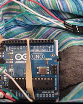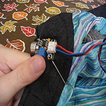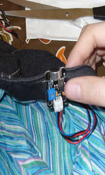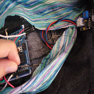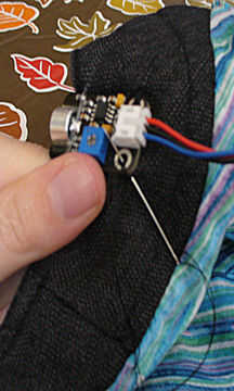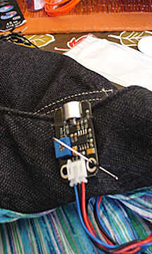 En primer lugar, un agujero a un lado de la chaqueta (AKA dentro) y cosí el sensor de sonido para el cuello de la chaqueta con hilo y aguja. Luego hice lo mismo con arduino, pero lo pongo en el agujero que hice.
