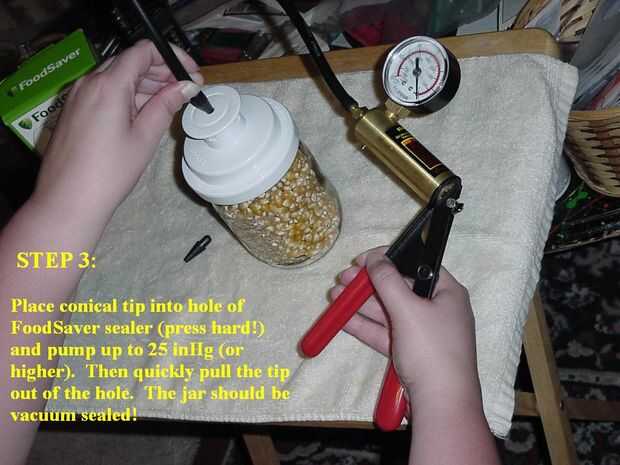 Presione el extremo cónico de la bomba de vacío en el orificio de la Selladora de tarro de masón (Asegúrese de presionar duro!). El purgador de freno de la bomba y observar el manómetro. La bomba hasta que tenga al menos 20 kPa vacío (cuanto mayor sea la lectura, mayor será el vacío). Cuando tienes un buen vacío tirado, rápidamente saque la punta del vacío del agujero, luego retire el accesorio de sellador tarro del frasco. Eso es todo! La jarra debe ser sellada al vacío!