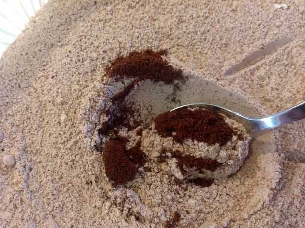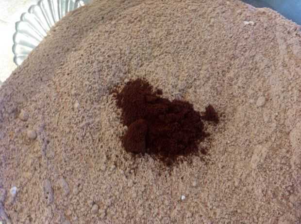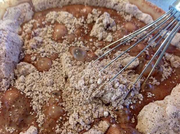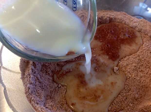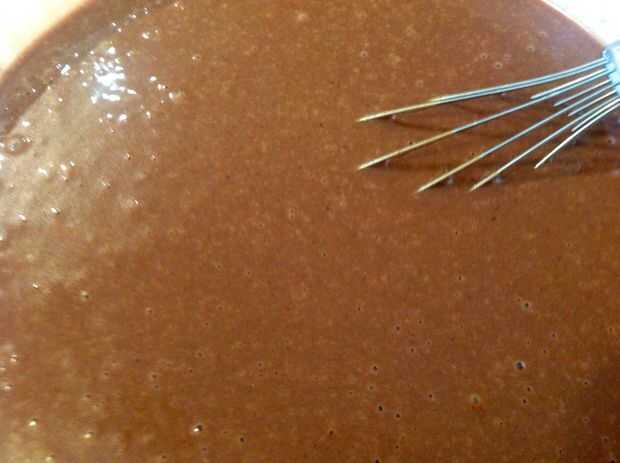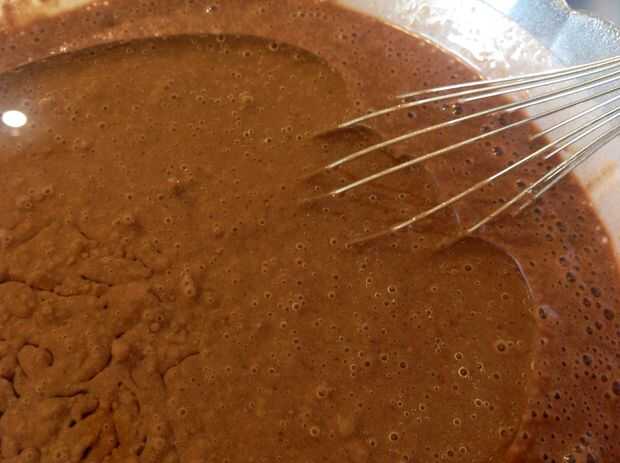 Mix all the ingredients in order as listed in the recipe. Recuerda añadir el agua caliente de última. Poner la masa de la torta en una sartén. He utilizado el molde de corazón. Hornear el pastel durante 20 minutos.