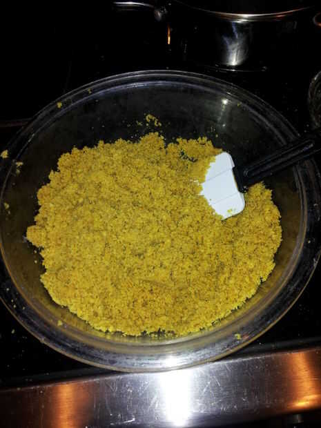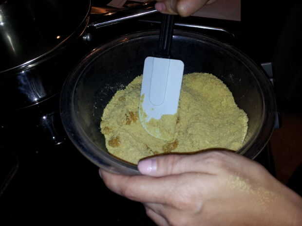 Revuelva junto hasta que quede bien mezclado y las migas se peguen. Puede probar si se adhieren bien si haces una bola en la mano y no desmoronarse.