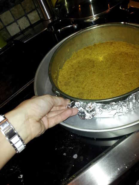 Por último, línea de la parte inferior de la forma del resorte de la cacerola con papel de aluminio. Finalmente pones tu pan de forma de resorte en una asadera grande o cualquier bandeja seguro que será lo suficientemente grande para la tarta de queso pan con 2 pintas de agua. Esto asegurará que el cheesecake se cocinen uniformemente.