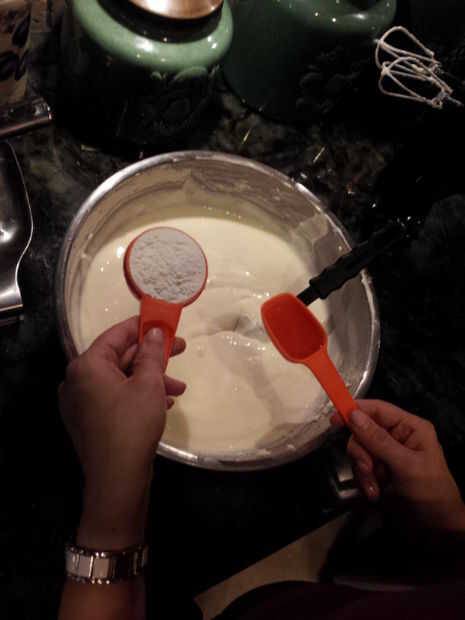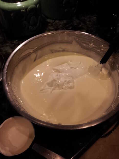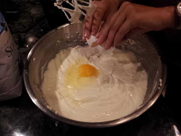 En un tazón grande, mezcle con una batidora de mano: queso crema con azúcar hasta suave y brillante. Ayuda para cortar primero el queso crema en cubos. Mezcla en la leche y luego se mezclan los huevos uno a la vez, mezclando lo suficiente como para incorporar. La mezcla de crema agria, la vainilla y la harina hasta que es muy suave. Ahora estamos listos para poner un toque especial en nuestro cheesecake!!!! ...