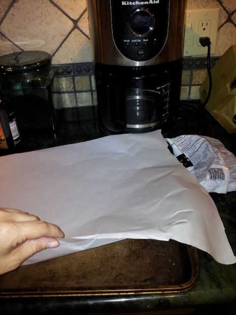 Forre el fondo con papel encerado. Luego derretir el chocolate sobre un fogón. Usé un tazón de fuente y un bote con agua dentro de la olla hirviendo. REVUELVA CONTINUAMENTE. Siempre no dejarlo e ir sentarse en su trasero y ver T.V. Se quema fácilmente. :)