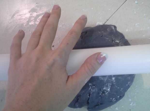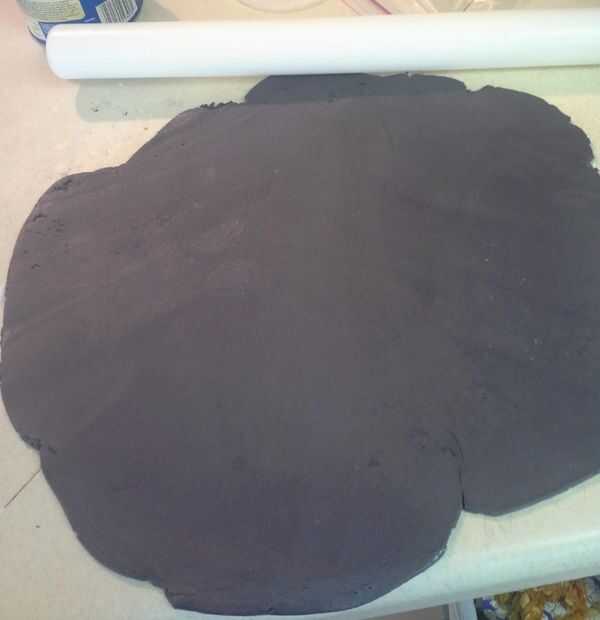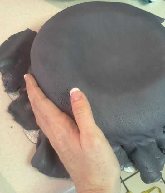 Polvo de una superficie de trabajo generosamente con azúcar en polvo y estirar el fondant gris en un círculo con un diámetro de 19 pulgadas. Pone fondant a perno de balanceo y transferencia sobre al pastel. Liso por los lados y parte superior del fondant, asegurándose de que el fondant es tocar todas las superficies.