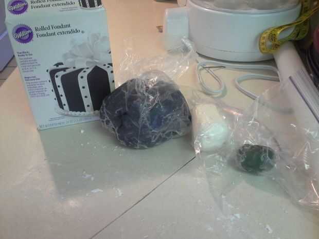 En primer lugar, usted necesita trabajar el color en el fondant blanco. Reserva unos 3/4 de taza de fondant blanco y reservar. Desde el blanco restante, unas cucharadas de pasta de azúcar y mezclar en un poco de verde y un smidge de tinte negro para hacer un verde oscuro, oscuro. Tomar el fondant blanco restante e incorpore alimentos negro colorear hasta que un gris oscuro (bien, mina terminó con un tinte púrpura, pero está todo bien).