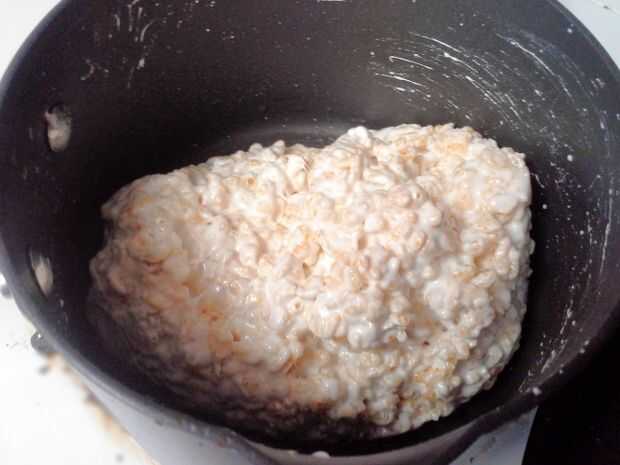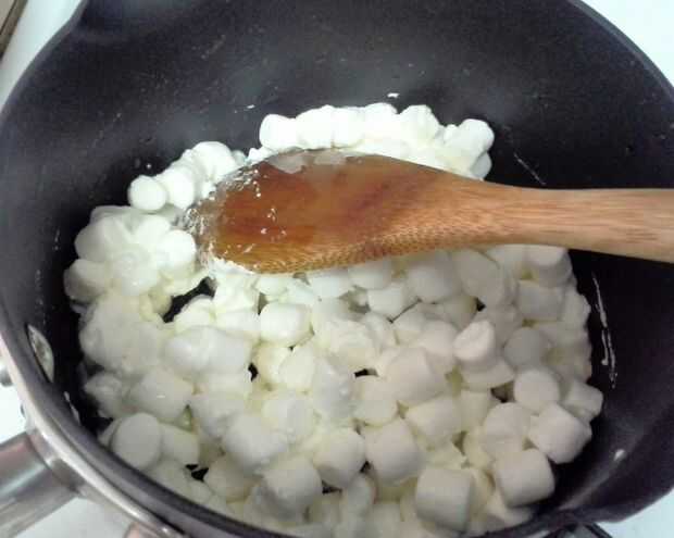 Coloque 2 cucharadas de manteca en una cacerola pequeña sobre fuego lento y calientan hasta que se derritan. Agregue malvaviscos y cocine, revolviendo constantemente, hasta que han fundido en una gran masa blanca. Retirar la cacerola del fuego y agregue el arroz krispies. Asegúrese de que usted en revolver muy bien, para que no tenga cualquier parche grande de melcocha simple izquierda.