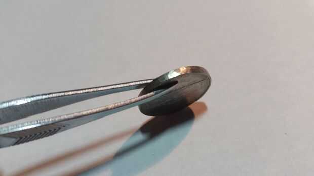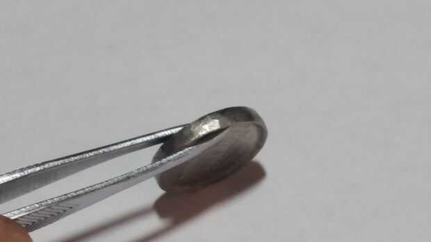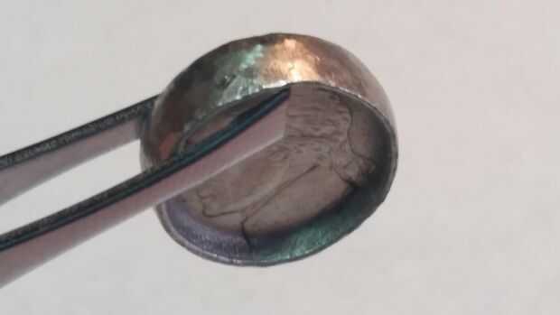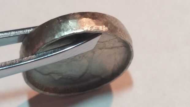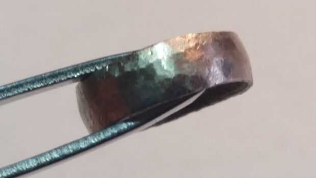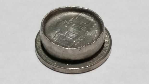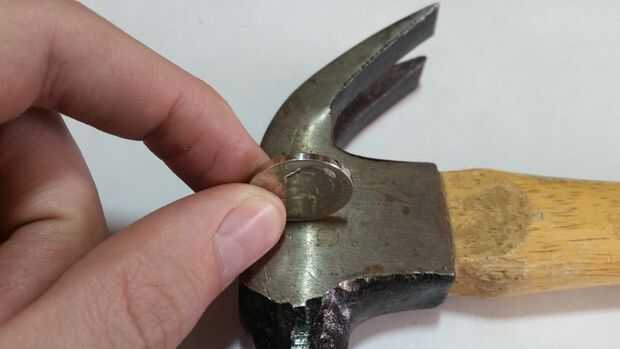Mantenga el níquel en su lado sobre el primer martillo/yunque. Formar el anillo golpeando la parte del níquel mientras rueda para asegurar una uniforme 'seta'. Después de algún tiempo, se forma el anillo. Parada cuando se alcanza el tamaño deseado del anillo.