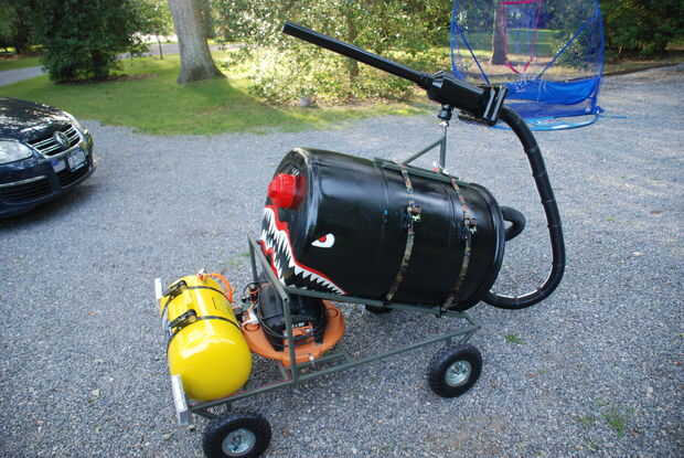 Volver al aplastador de pelota de Ping Pong. Esta creación es diferente a cualquier otro lanzador neumático creado. Lanzadores neumáticos tradicionales utilizan un sistema de alta presión, bajo volumen y generalmente sólo son capaces de lanzar un proyectil cargado de barril (comúnmente una papa) y entonces pueden lanzar este objeto ahora, pero a un ritmo muy lento, a menudo toma más de un minuto antes de un lanzamiento de seguimiento es posible y sería muy peligroso para golpear a alguien con.