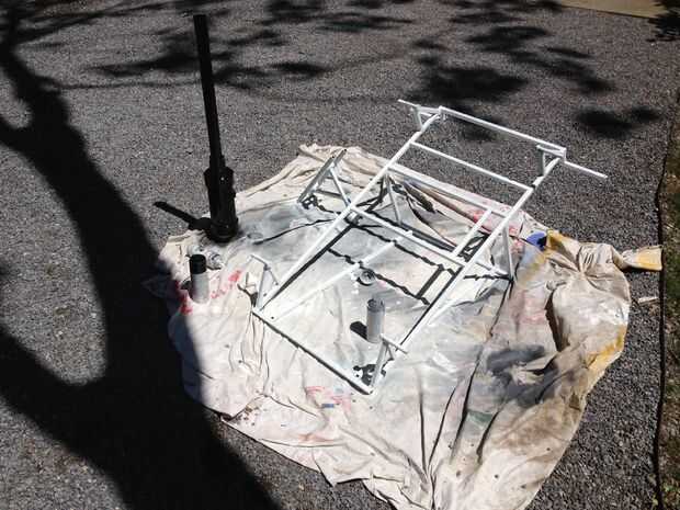 1) en un paño, pintar la parte superior e inferior de la estructura de acero para no oxidarse. Primero puse sobre una capa de imprimación blanca y luego pasó con un color verde camuflaje para la capa final.