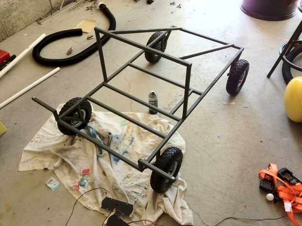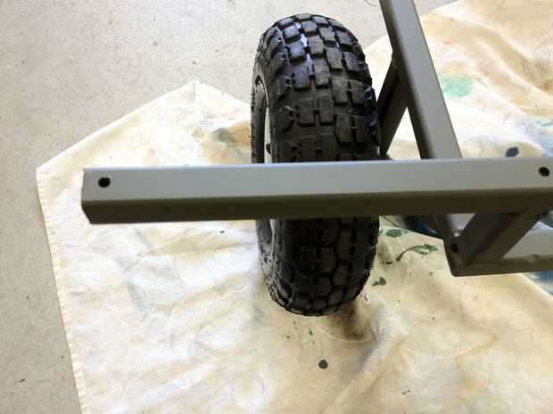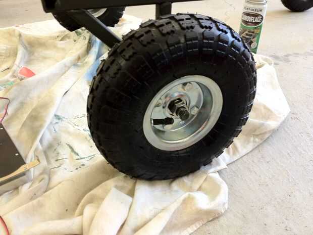 2) una vez que la pintura esté seca, coloque y atornille las ruedas en su lugar en el marco de