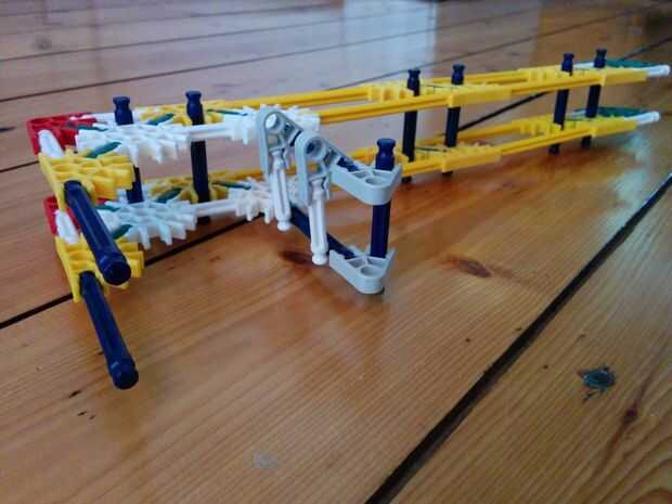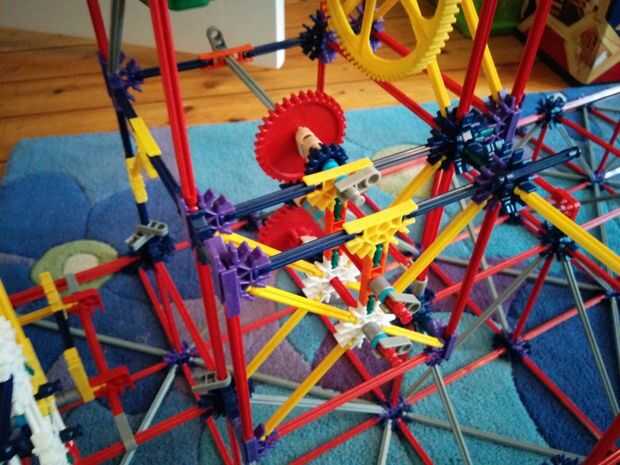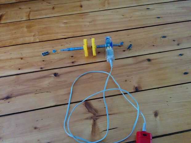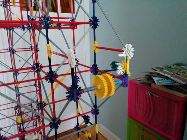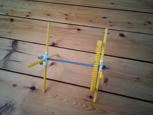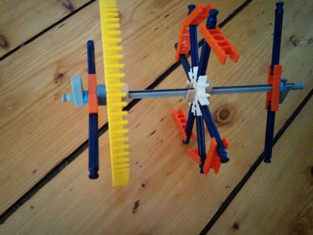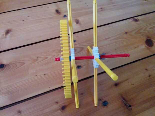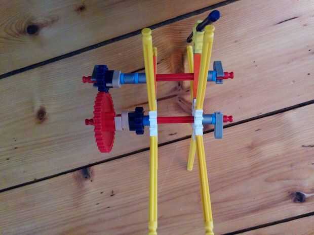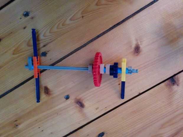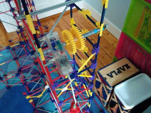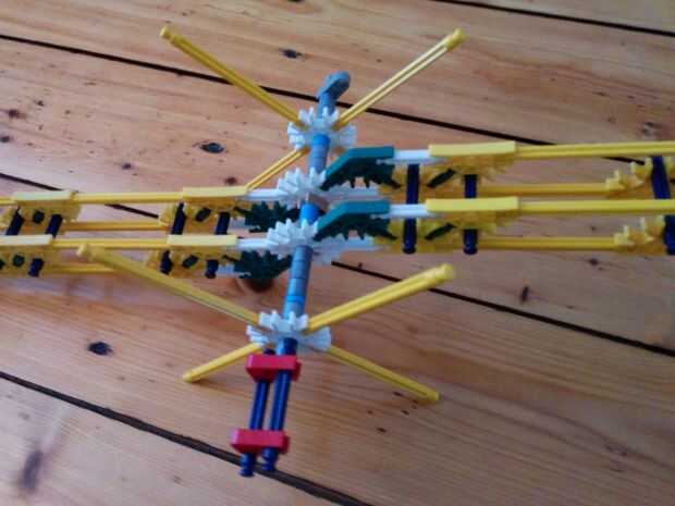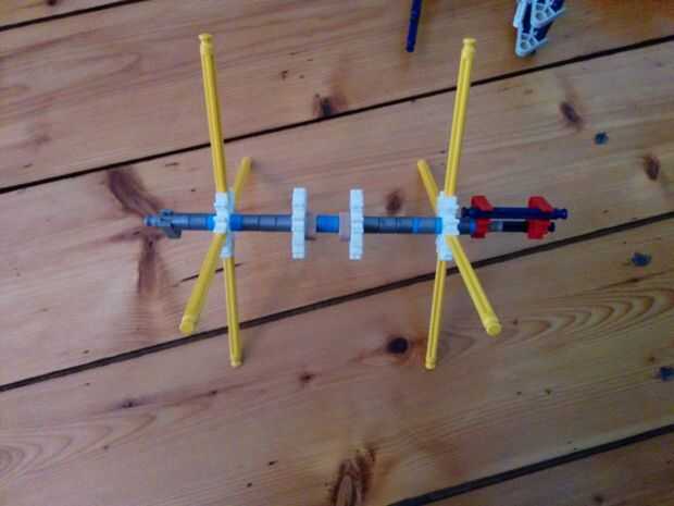 Ahora vamos a hacer el motor y los engranajes de la gran torre pequeña. Como se aprecia en el cuadro 7 se va a colocar este motor en la parte superior de la torre. Ahora hay 5 espaciadores gris y dos espaciadores azul en el lado izquierdo de los engranajes. Y en el lado derecho hay 3 discos gris y un motor. Entre los dos engranajes hay dos pines que se enclavija. Cuando han puesto el motor en la parte superior de la torre, vas a colocar un espaciador azul y un clip gris a cada lado de la torre. Como se puede ver en la imagen.