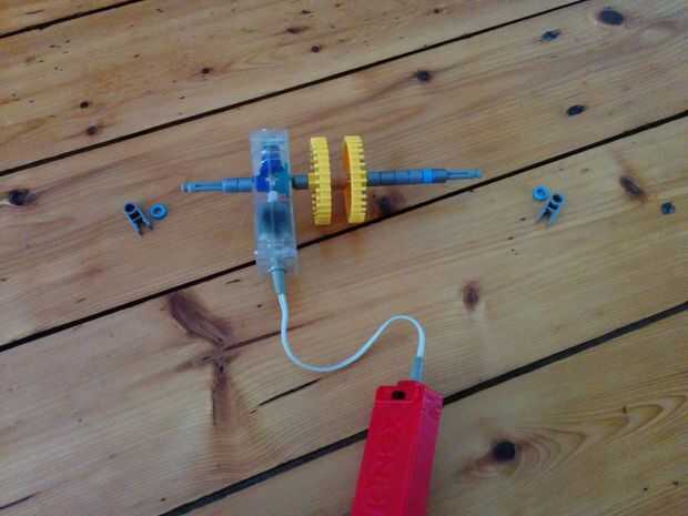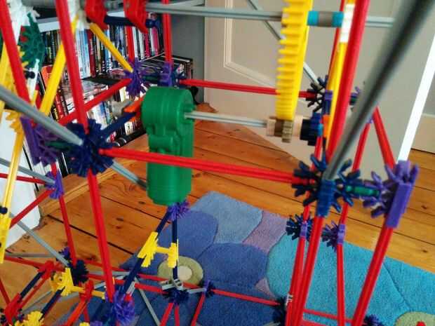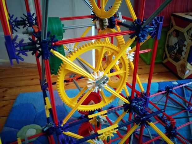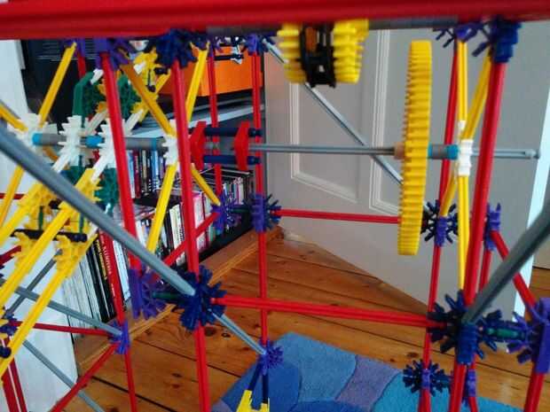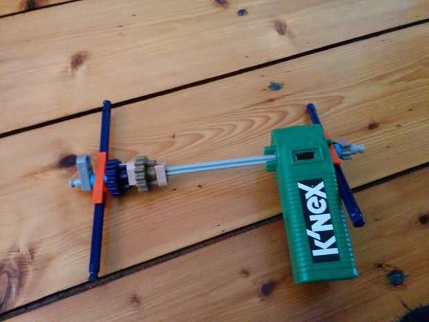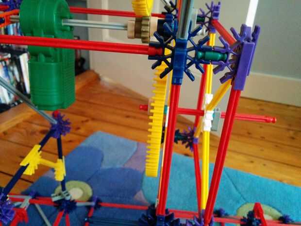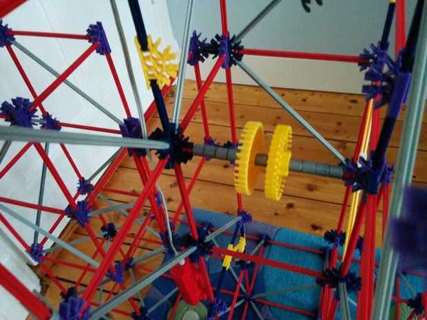 Ahora vamos a hacer la moto y los engranajes de la gran torre grande. Este se colocará en el centro de la torre, como se aprecia en el cuadro 9. Hay 5 espaciadores gris y dos espaciadores azul a la derecha de los engranajes. Hay un separador gris a la izquierda, que el motor y que los dos espaciadores gris. Entre los dos engranajes hay otra vez dos pasadores que se enclavija. Cuando usted ha colocado su motor quiere colocar un espaciador azul y un clip gris a cada lado.