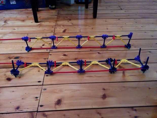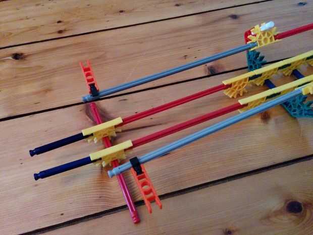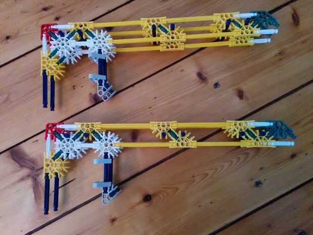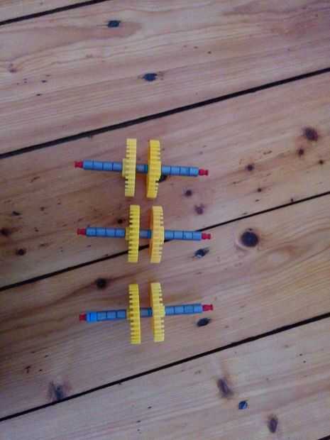Dos ascensores de la cadena que vamos a utilizar los engranajes que se pueden ver en la figura 2. Usted será capaz de ver la colocación de estas elevaciones en los cuadros 3-5. Habrá uno en la pequeña torre grande y dos en la torre grande grande. En cada lado de los engranajes hay 4 distanciadores gris. Y entre los dos engranajes hay un espaciador gris y un espaciador azul.
