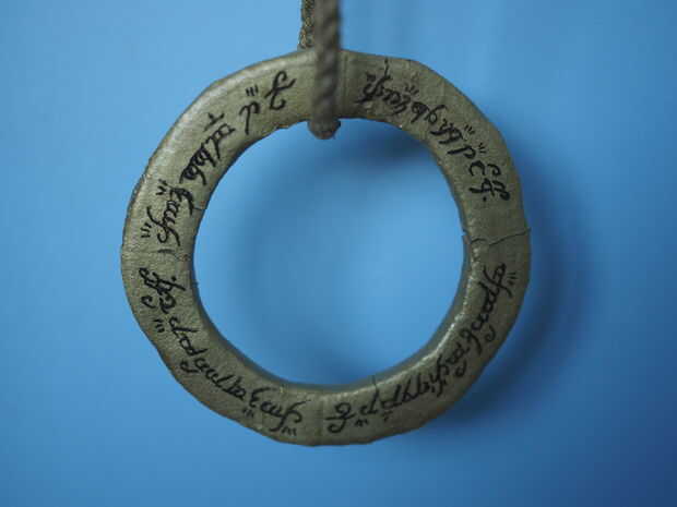 Encontré la imagen en blanco y negro en Google y utiliza como material de referencia. Usando eso, escribí las letras élficas alrededor del anillo pintado. Una vez más, probablemente podría utilizar un barniz transparente para sellar la inscripción pero no lo hice.