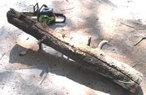 Vivimos en el bosque. Los árboles no son un problema. El que elegí fue práctico. Era un roble medio podrido que una tormenta sopló sobre detrás de mi tienda. Corté unos cinco pies fuera del registro, dejando talones donde cortó las extremidades. Tomé la motosierra y cortar una muesca en la parte superior. Yo corte una ranura en el árbol a la base para el acorde de la energía.