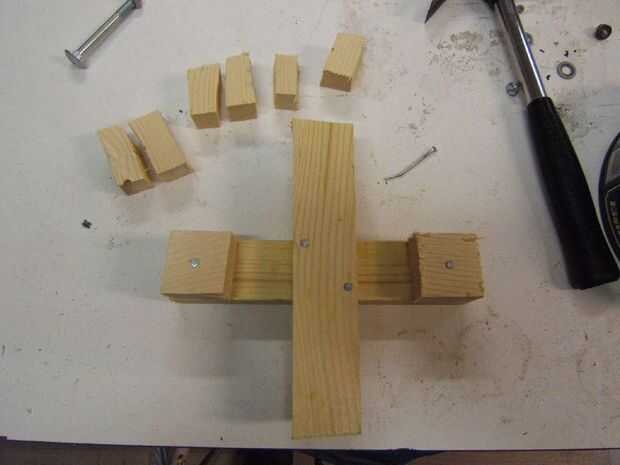 Perforación a medio camino a través de los pequeños bloques antes de que los clavos en los extremos de las piezas más largas los hace menos propensos a agrietarse. Un toque. Deseo que había pensado en esto antes.