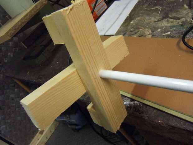 Perfore un agujero en el centro de la cruz que es lo suficientemente ancha para que la varilla se ajusta sólo. Empuje (o martillo) en. Con suerte, está atascado.