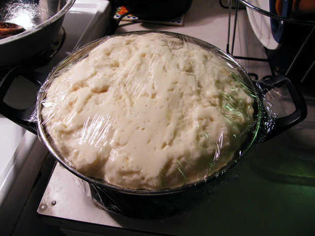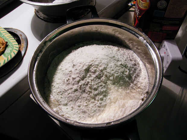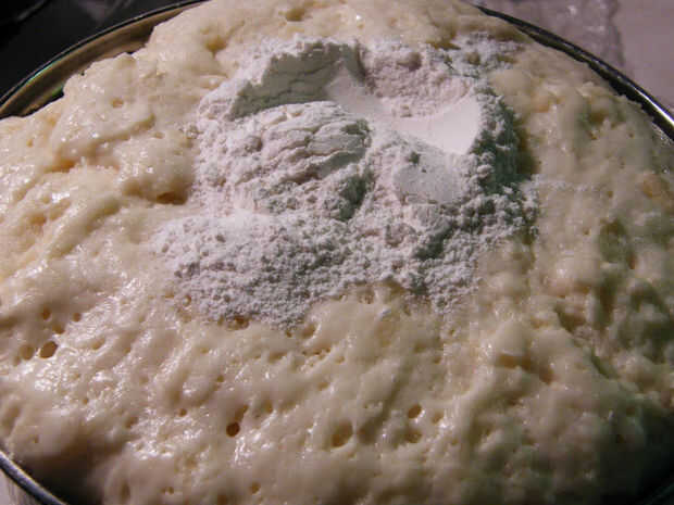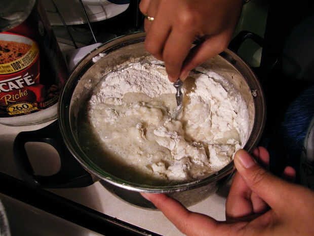 Añadir en 3 c de harina, revuelva hasta combinar sólo, luego cubrir con toalla limpia o con envoltura de plástico, para una hora de duración (duplicará en tamaño).