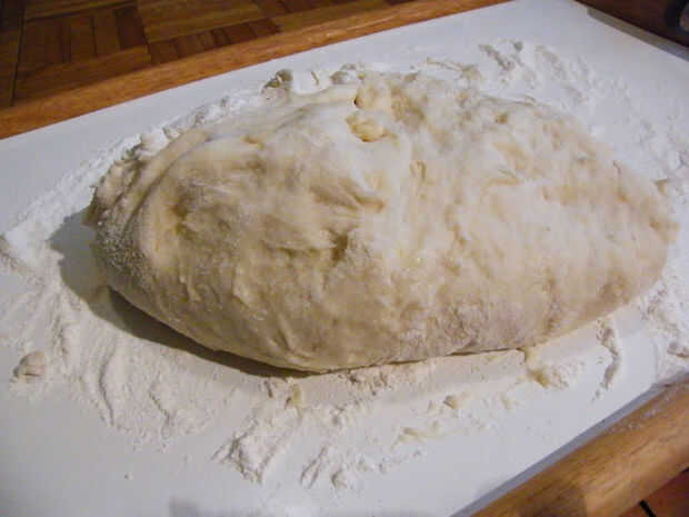Espolvoree la tabla de trabajo con harina, poner la masa y amasar un poco.