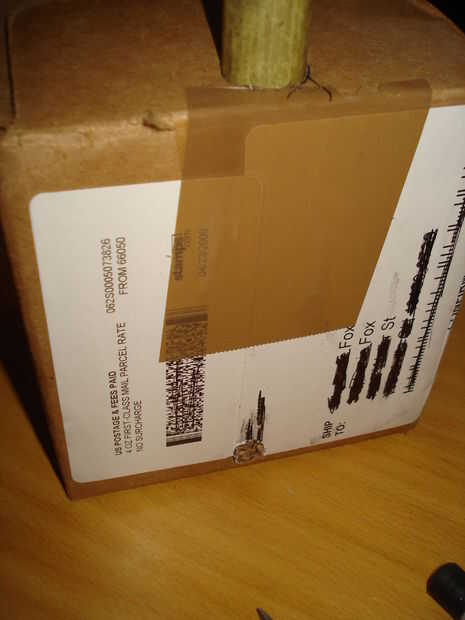 2 cortar los agujeros en su increíble de la caja, uno para insertar su stick'o' madera en y en la parte frontal de su caja cerca de la parte inferior.