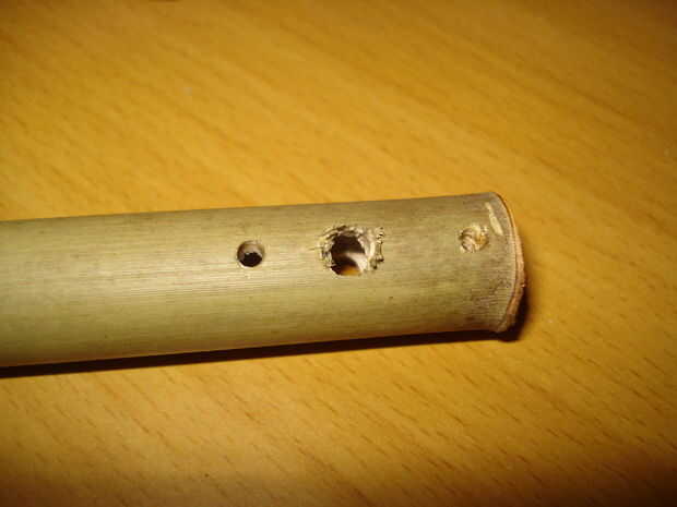 Uno en el extremo inferior, cerca del borde. Esta se realiza mejor en un ángulo con el agujero que va desde la parte inferior de la palanca de al lado. (vaya ojeada en el paso 6 para ver por qué)