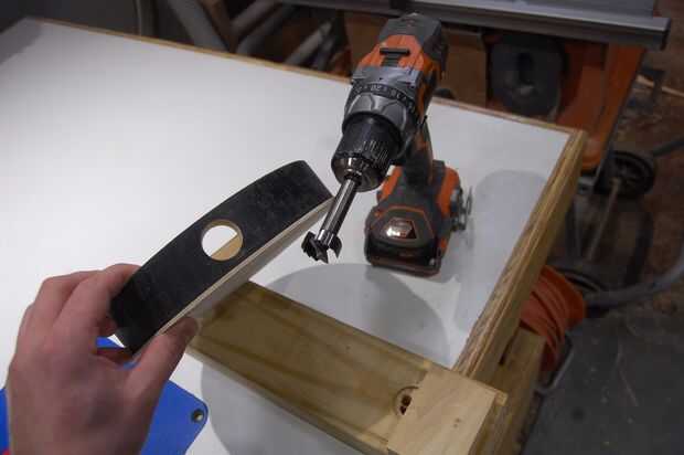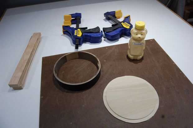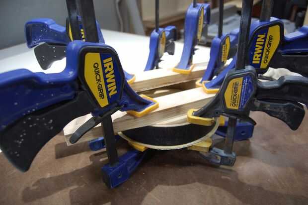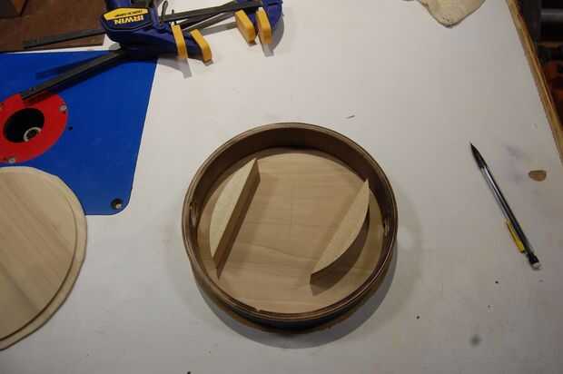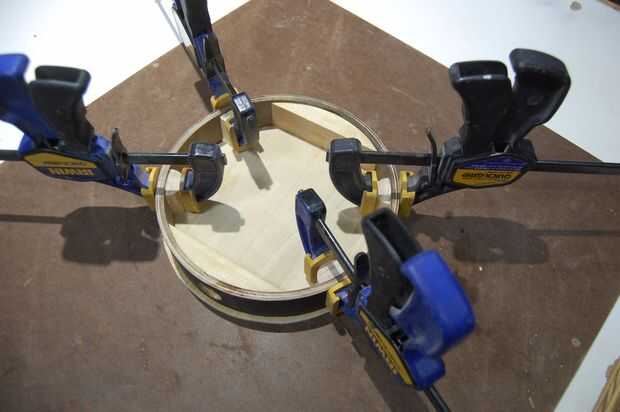 Pegamento para arriba del cuerpo comienza con el panel frontal. Sólo Unte pegamento en la ranura circular, la cáscara y añadir algunas abrazaderas. Yo solía algunas cauls en un intento de igualar la presión.