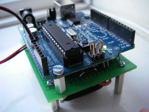 Por eso, surgió la Undershield del AA. Utiliza 2 pilas AA y aumenta la tensión hasta 5V, utilizando un MAX756 IC para alimentar el Arduino.