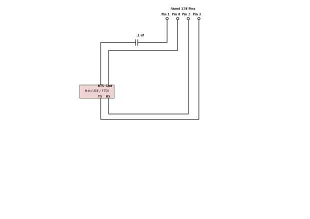 La interfaz particular que tenemos es una interfaz de FTDI de USB Mini azul, similar a la oficial Arduino revisado Mini adaptador USB. Necesitamos conectar FTDI RTS (DTR en otros modelos) al Pin 1 de la Atmel 328 a través un 100nF condensador (.1uF). Esto permitirá el auto reset en subidas del bosquejo. También necesitamos conectar FTDI TX TX (ya sé, suena extraño, pero es lo que es) en el Atmel 328 Pin 2, RX FTDI para RX en el Atmel 328 Pin 3 y GND FTDI para Atmel GND. No se conectará 3.3v o 5v como utilizamos una fuente de alimentación separada.