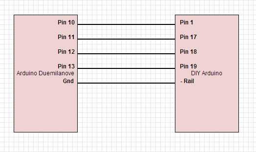 Ahora que tienes tu Arduino DIY construido, conecte a un Duemilanove como sigue. Este método no funciona con la nueva Arduino UNO, pero hay métodos para que así, no hemos podido probar aún. Dependiendo de que método/gestor de arranque que quema, que va a determinar qué tabla es especificar en el futuro al subir bocetos.